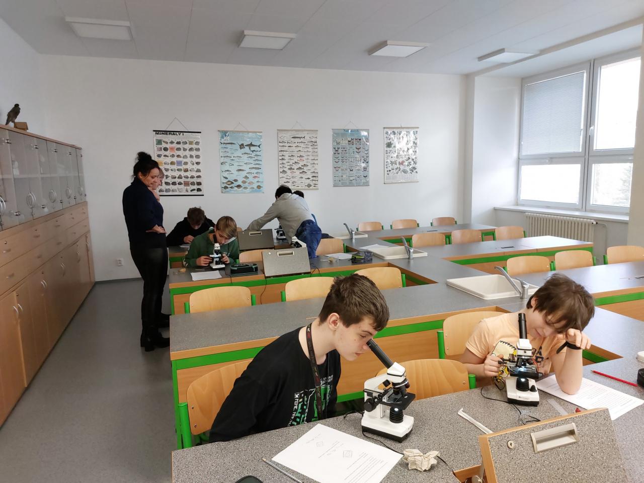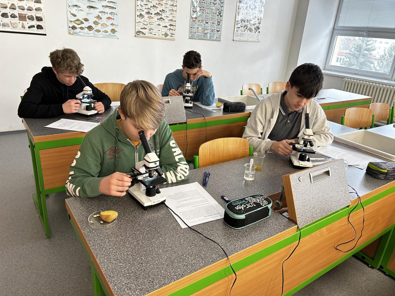Laboratorní práce byla letos poměrně náročná. Žáci a žákyně 6. a 7. tříd měli pozorovat krystaly šťavelanu vápenatého v suknici cibule, ve stonku podeňky a v šípku. Druhá kategorie, žáci 8. a 9. tříd, využili nakrájenou hlízu lilku bramboru, namočenou a rozkrojenou obilku kukuřice, rozkrojené a nabobtnalé semeno fazolu. Měli najít a zakreslit zrnka škrobu. Vždy tedy tři mikroskopické úkoly v rámci jedné laboratorní práce.