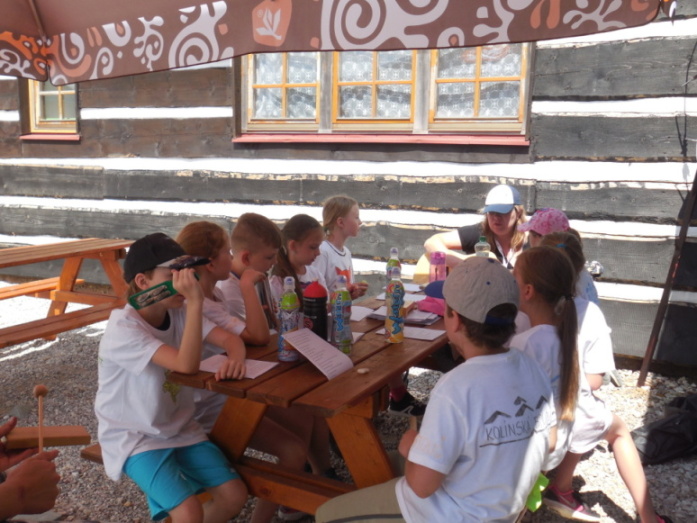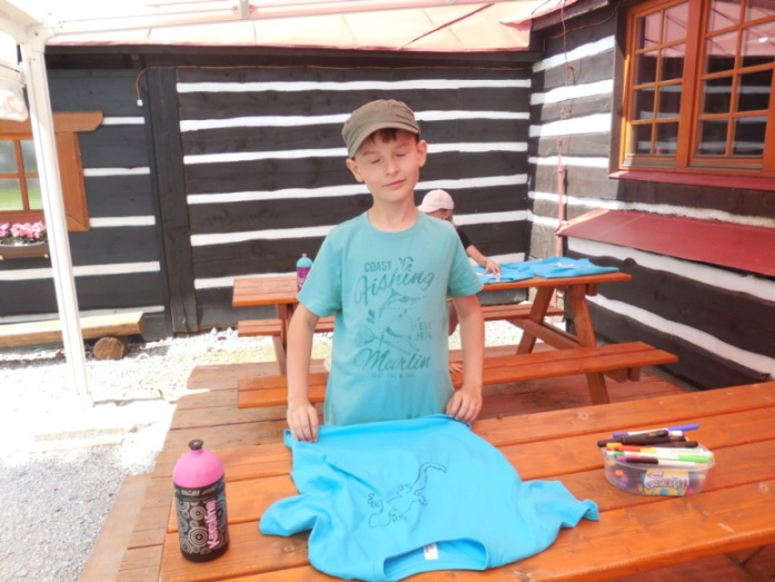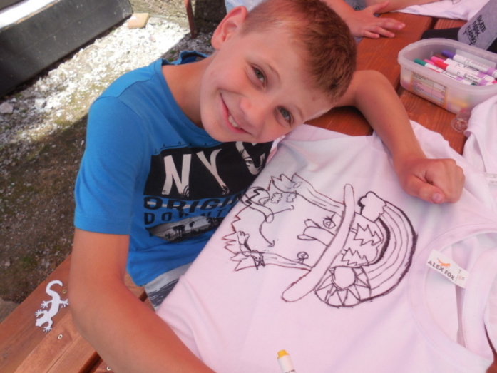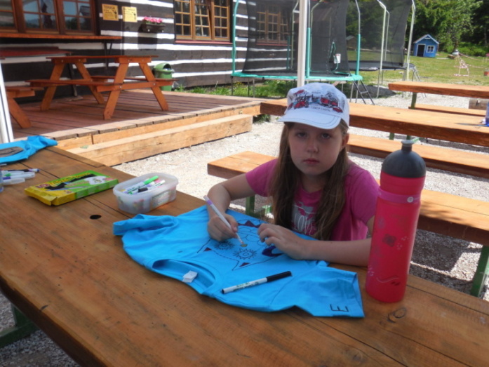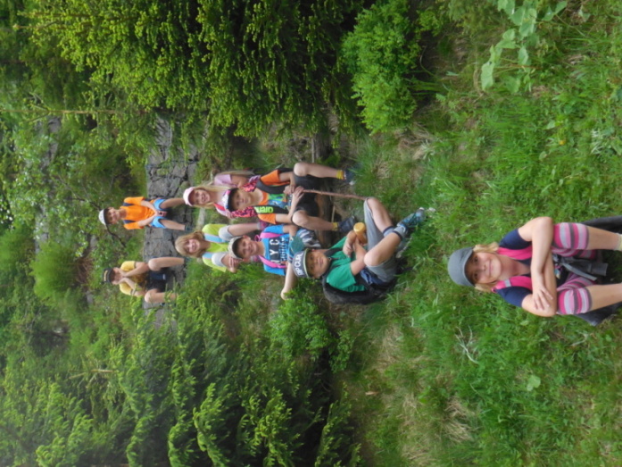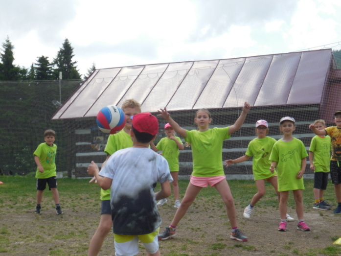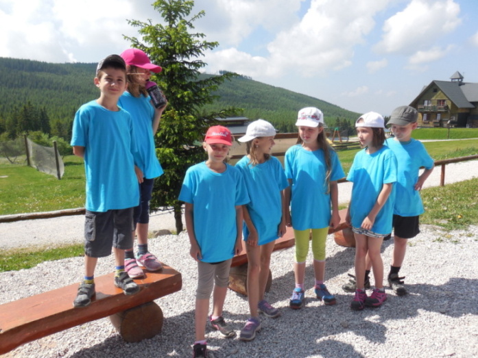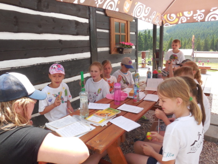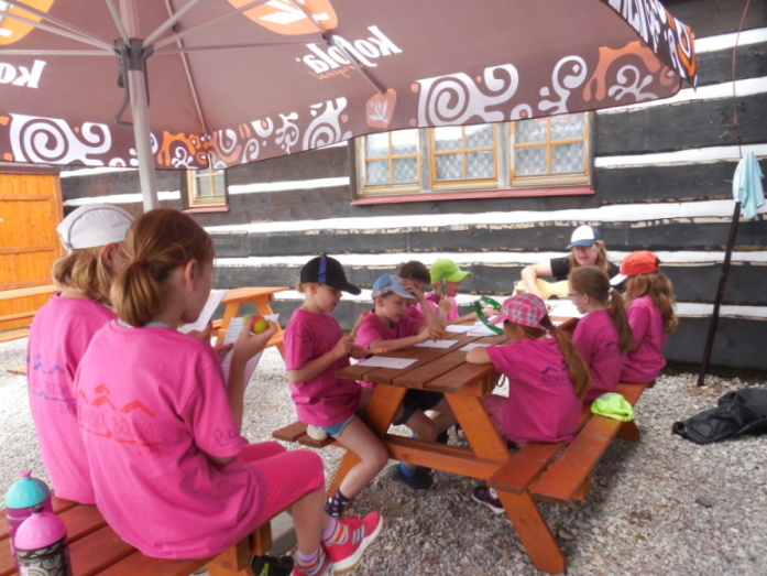 I dnes krásně slunce svítí, nám se nechce v chatě býti. Do družstev se rozdělíme, různé úkoly plníme. Zpěv s kytarou, to je hračka, další děti zdobí trička. Nehrajeme na honěnou, ale pravou vybíjenou. Po obědě vyrážíme, Černou horu zdoláváme. Všichni pěkně šlapeme, čerstvý vzdoušek dýcháme. A večerní sportování překazilo hromování. Padá kapka za kapkou, tak sedíme nad mapkou. Pohádku si pustíme, lehneme a hned spíme.