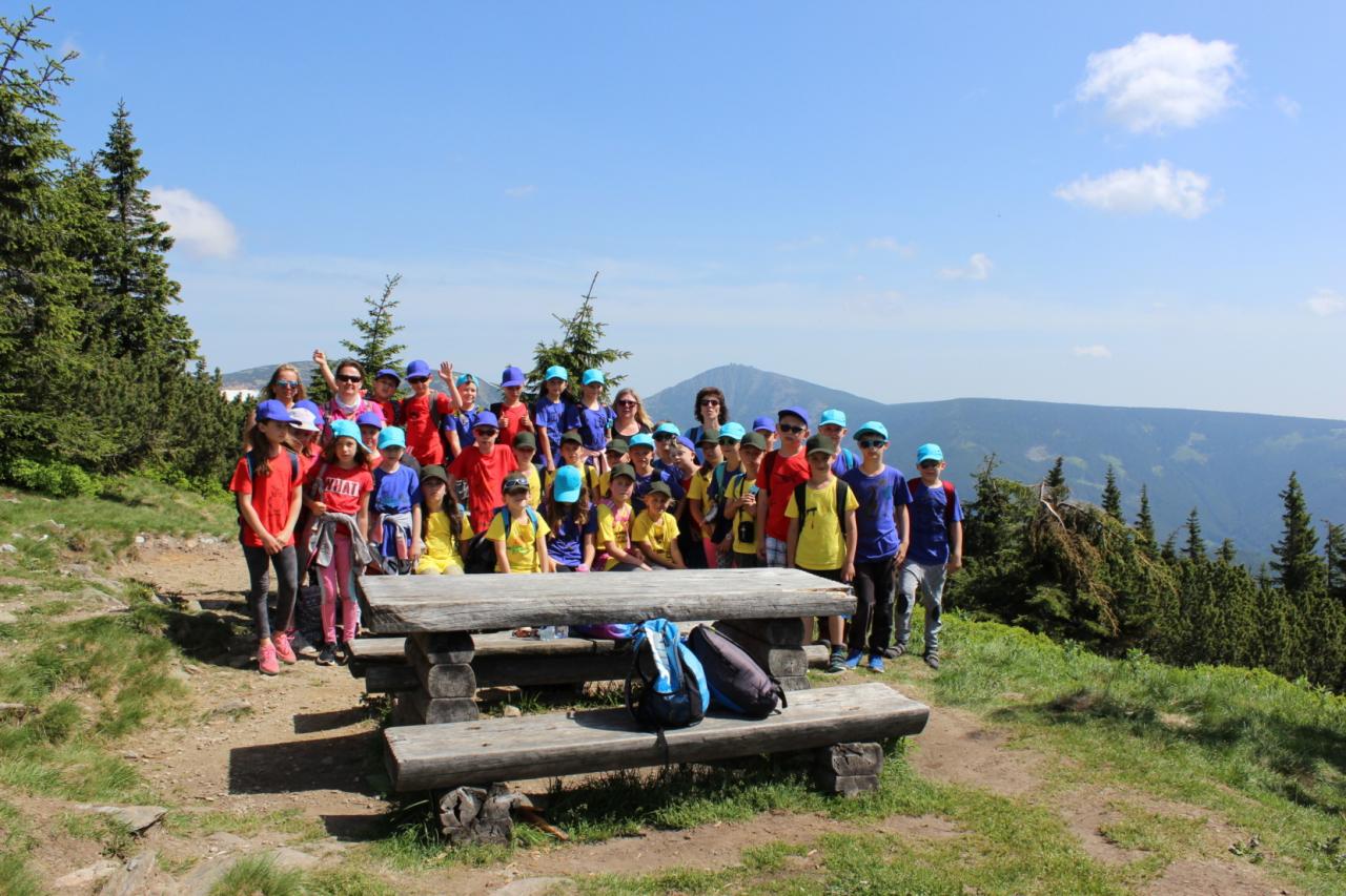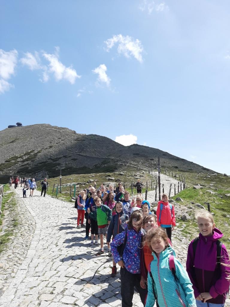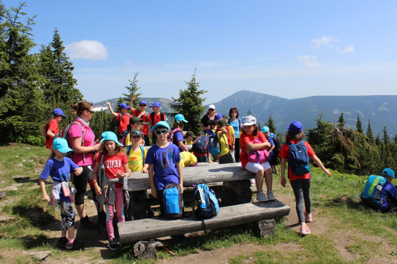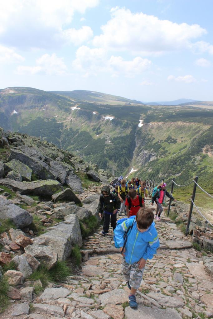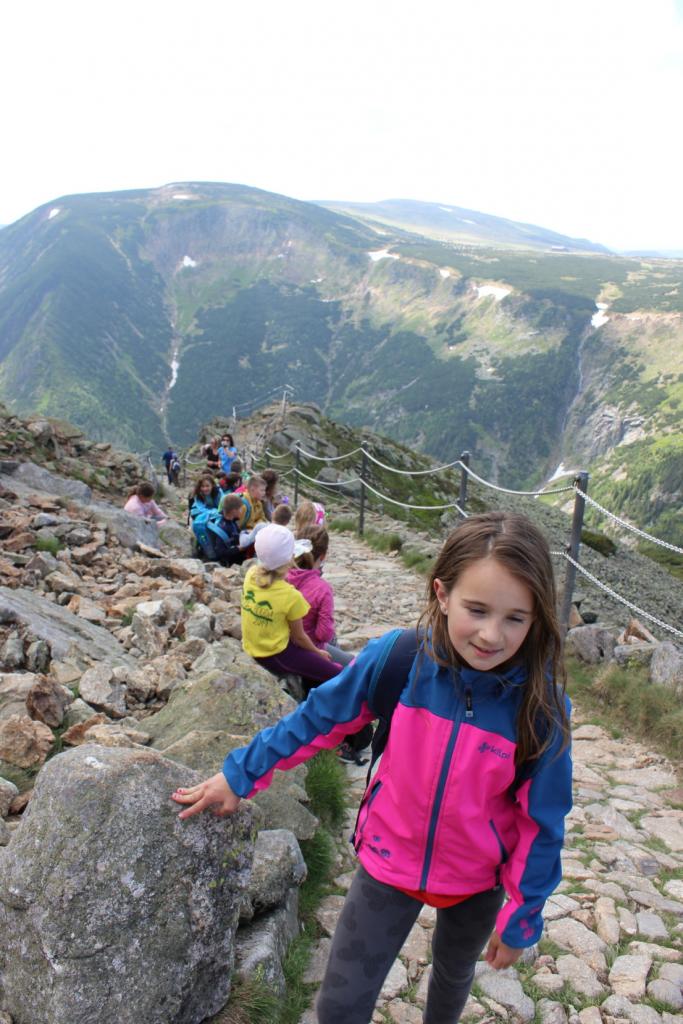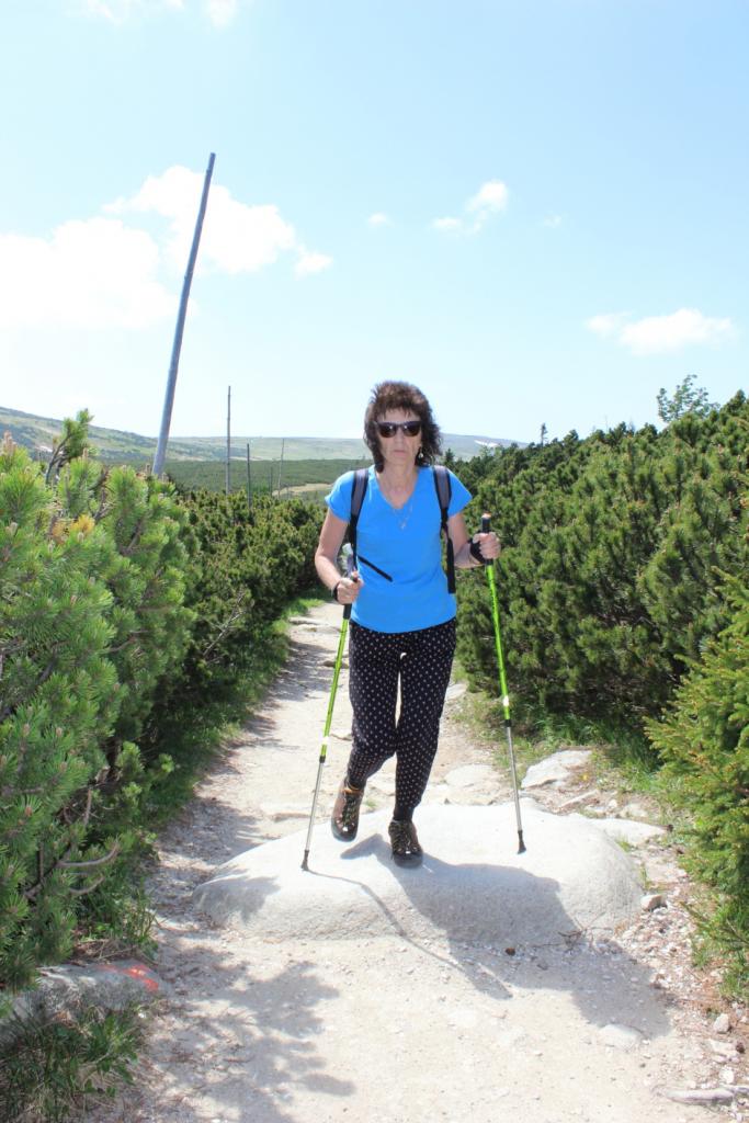 Snídaně zas dobrá byla, všechny pěkně posílila. Levá, pravá jdeme hned, cíl nás nutí jíti vpřed. Lyžařskou už míjíme, kopec před námi však stále je. Na vyhlídce, to je krása, srdce Čecha nad tím jásá. Sněžku v dáli vidím hned, posvačím a chytím dech. Výrovka a bouda Luční, kdopak nám to vzadu hluční? Kráčíme si pospolu k slunečnímu vrcholu. Na Sněžce se fotit musí, máme na to doklady, ať pak nejsou dohady. Sněžka zdolána 12.6. 2019