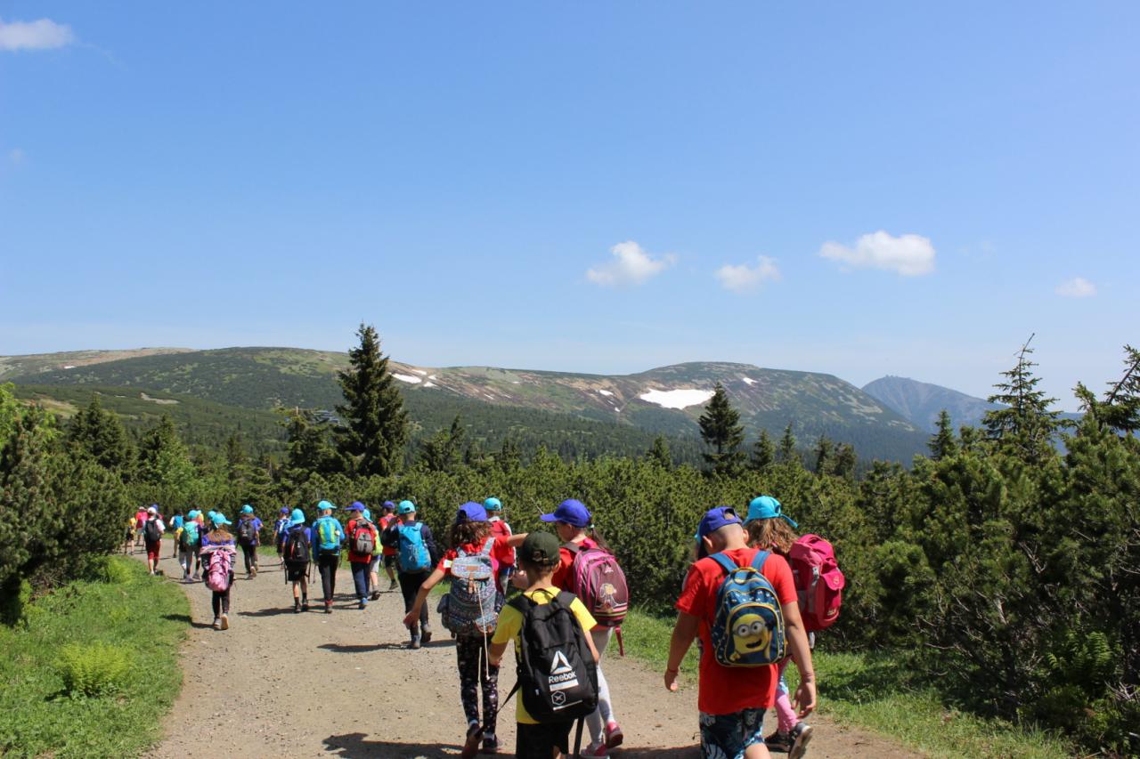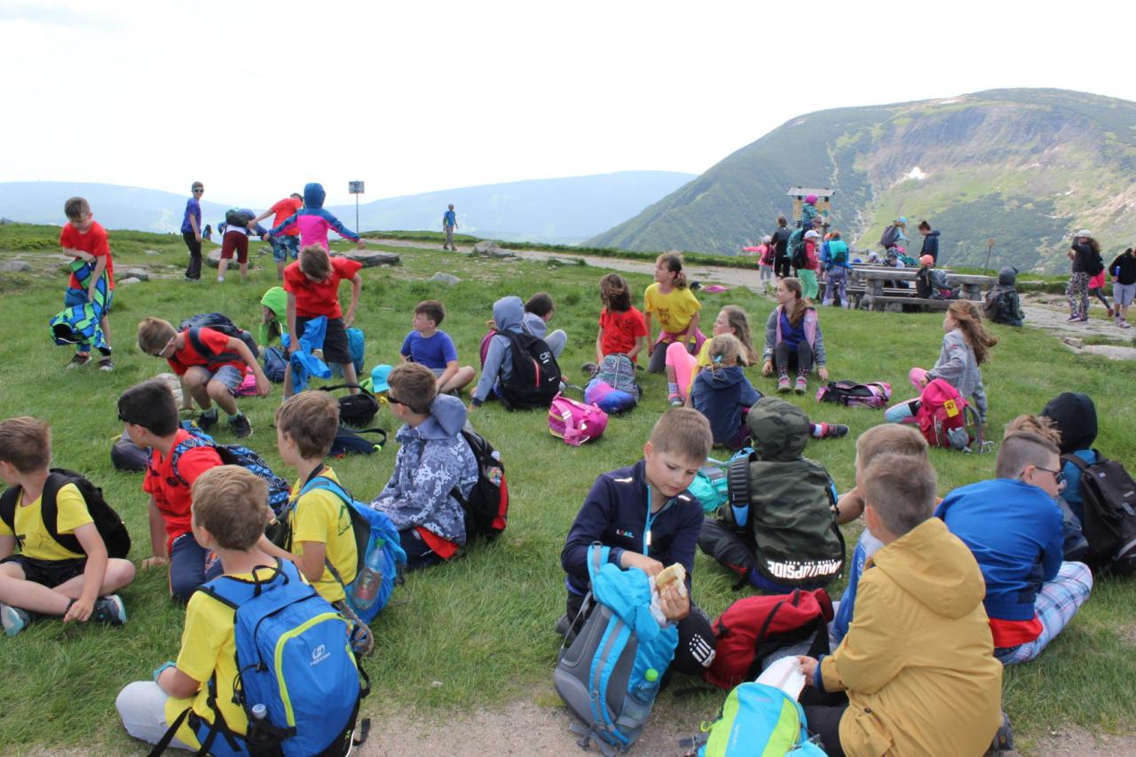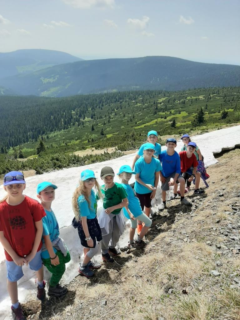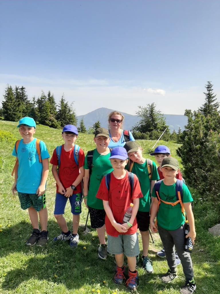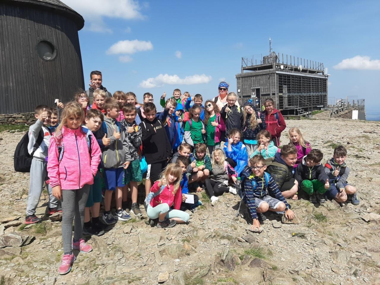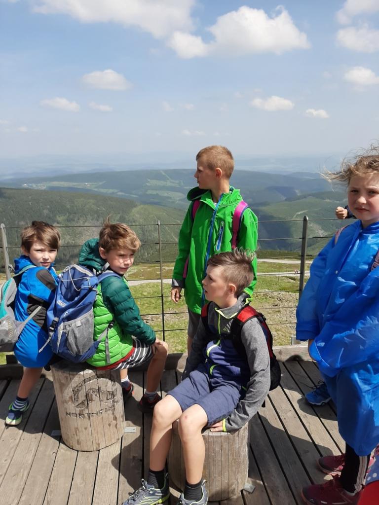 Snídaně zas dobrá byla, všechny pěkně posílila. Levá, pravá jdeme hned, cíl nás nutí jíti vpřed. Lyžařskou už míjíme, kopec před námi však stále je. Na vyhlídce, to je krása, srdce Čecha nad tím jásá. Sněžku v dáli vidím hned, posvačím a chytím dech. Výrovka a bouda Luční, kdopak nám to vzadu hluční? Kráčíme si pospolu k slunečnímu vrcholu. Na Sněžce se fotit musí, máme na to doklady, ať pak nejsou dohady. Sněžka zdolána 12.6. 2019