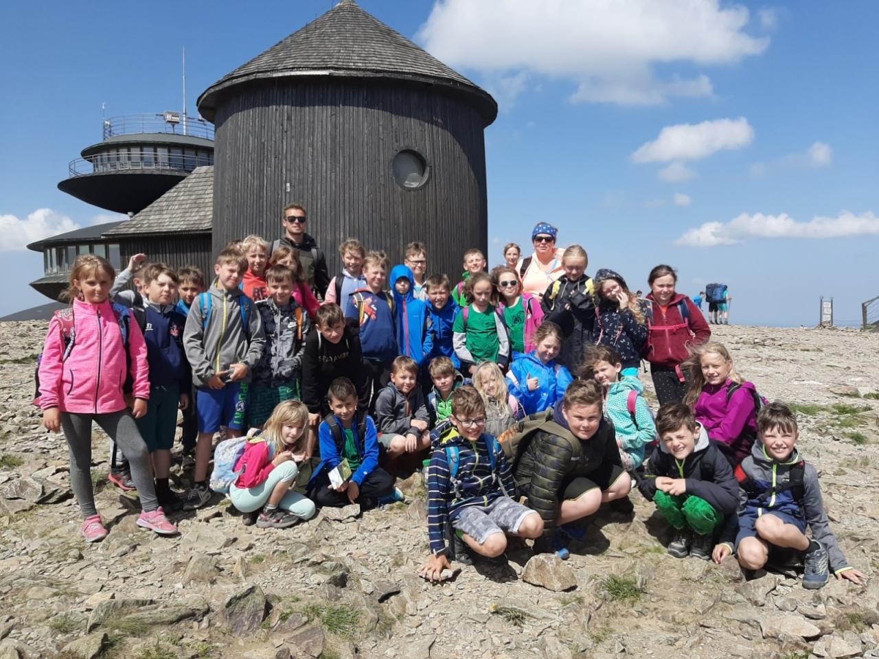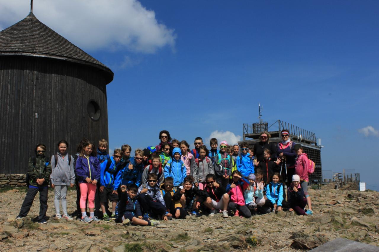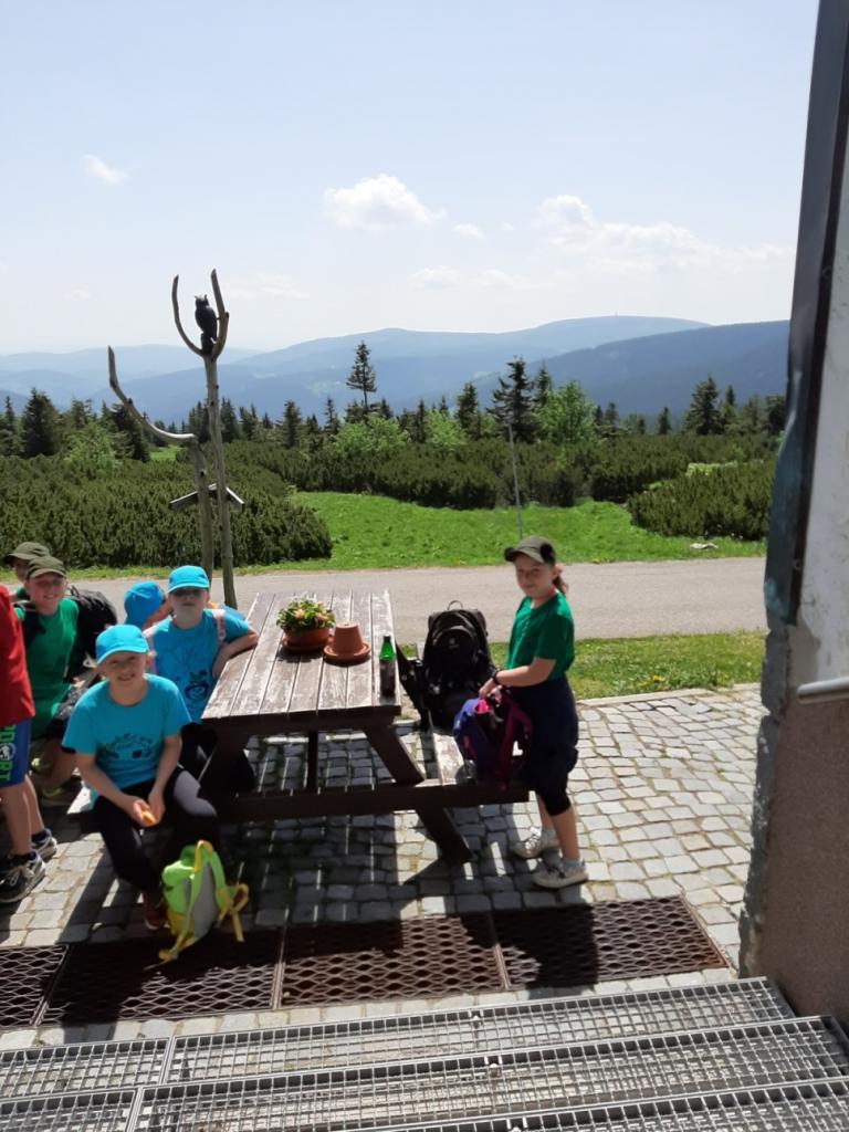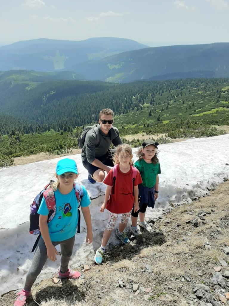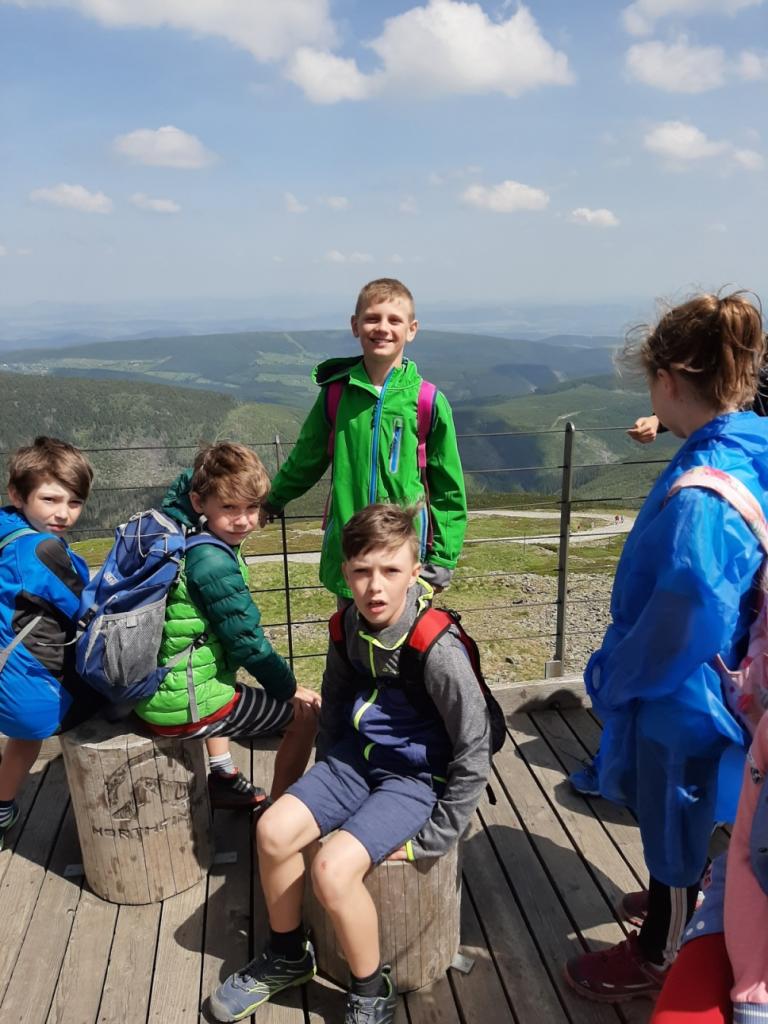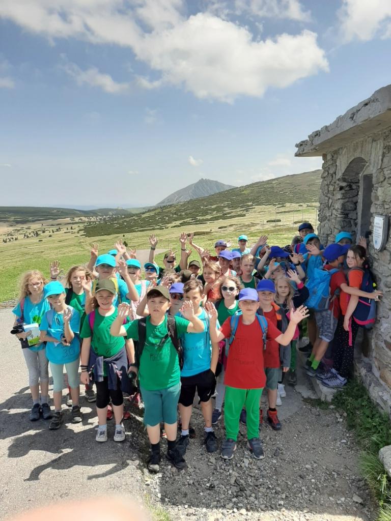 Snídaně zas dobrá byla, všechny pěkně posílila. Levá, pravá jdeme hned, cíl nás nutí jíti vpřed. Lyžařskou už míjíme, kopec před námi však stále je. Na vyhlídce, to je krása, srdce Čecha nad tím jásá. Sněžku v dáli vidím hned, posvačím a chytím dech. Výrovka a bouda Luční, kdopak nám to vzadu hluční? Kráčíme si pospolu k slunečnímu vrcholu. Na Sněžce se fotit musí, máme na to doklady, ať pak nejsou dohady. Sněžka zdolána 12.6. 2019