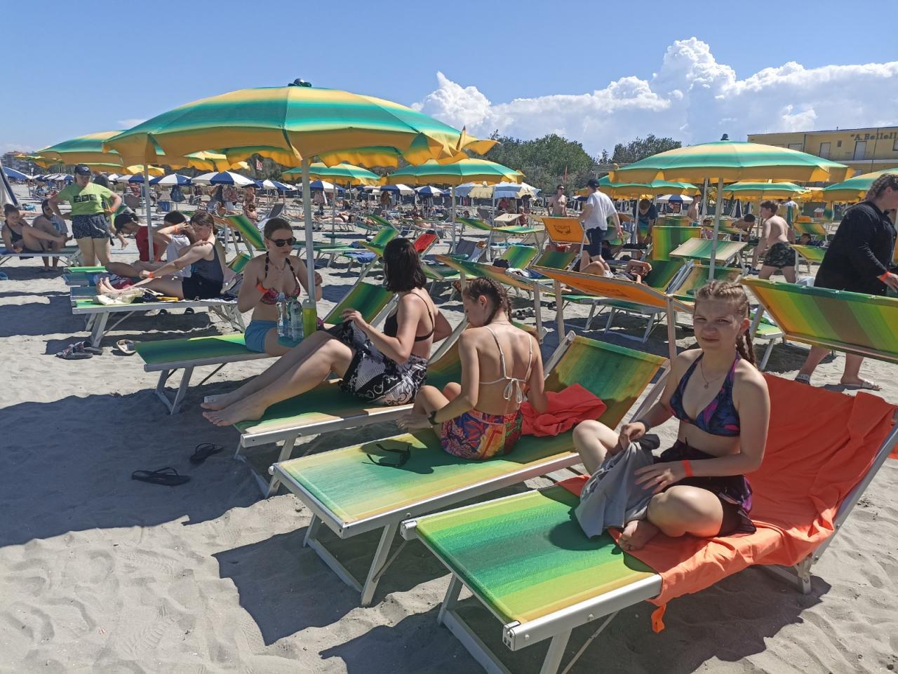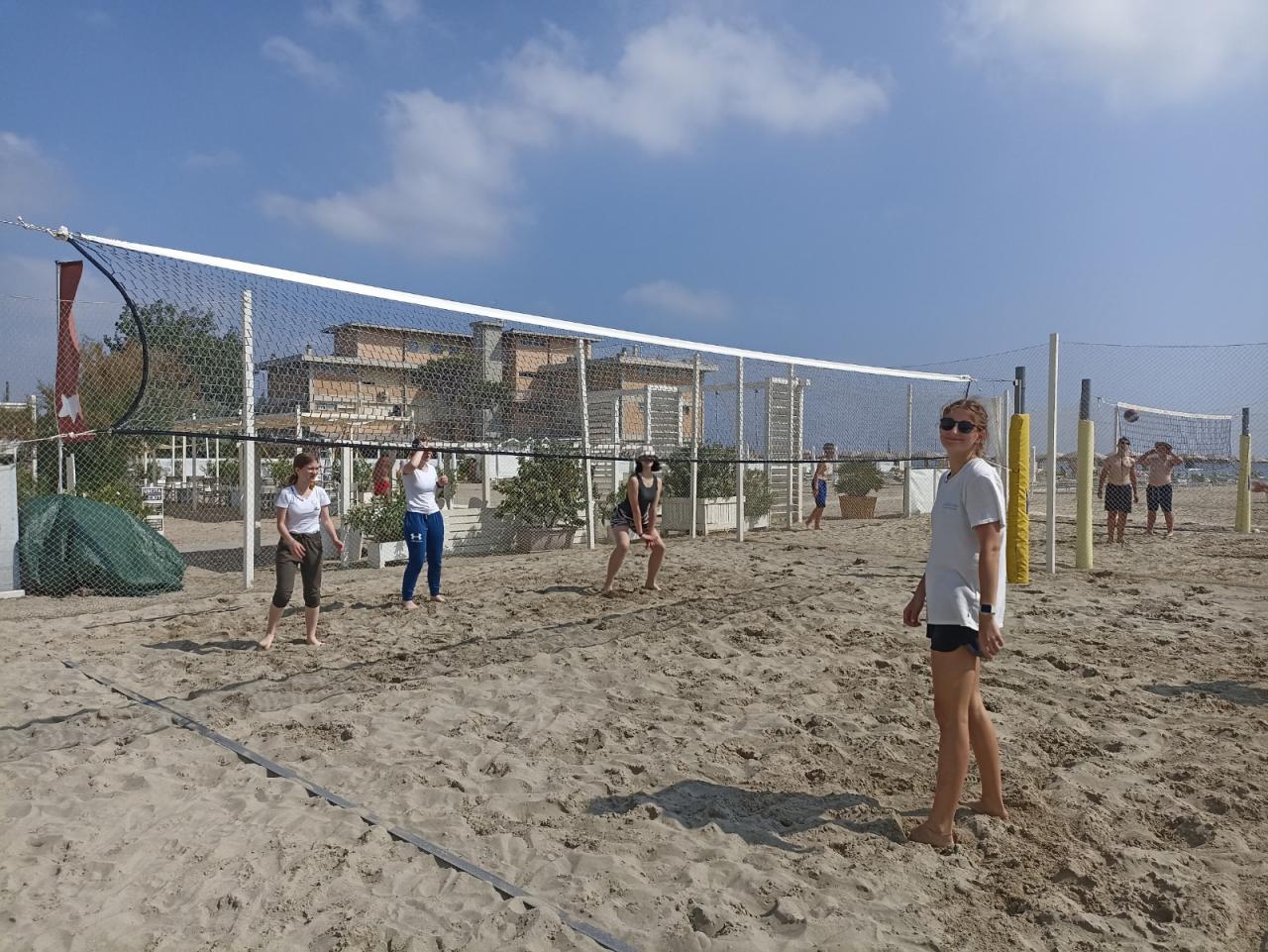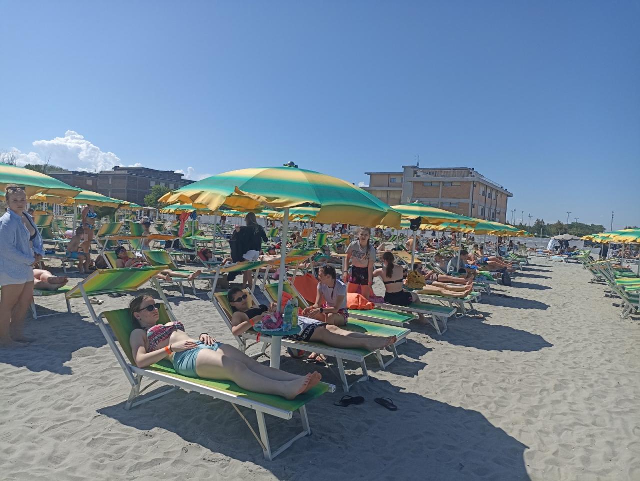 Cesta byla celkem bez problémů a zdržení nebylo téměř žádné. Počasí bylo krásné, sluníčko svítilo a my si čekání na ubytování zkrátili sportem. Také jsme se podívali po areálu a seznámili se s okolím. Kolem oběda jsme se ubytovali, vybalili a ve tři hodiny jsme šli na pláž a vyzkoušeli teplotu moře. Vál příjemný vánek a sluníčko připalovalo, tak někteří z nás začali pěkně červenat. Po dlouhé cestě jsme vyhladověli a těšili se na večeři. Po jídle nás čekalo rozdělení do družstev podle barev, vybrali jsme si originální název svého družstva a bojový pokřik. Pak už nás čekala večerka a zasloužený odpočinek.
