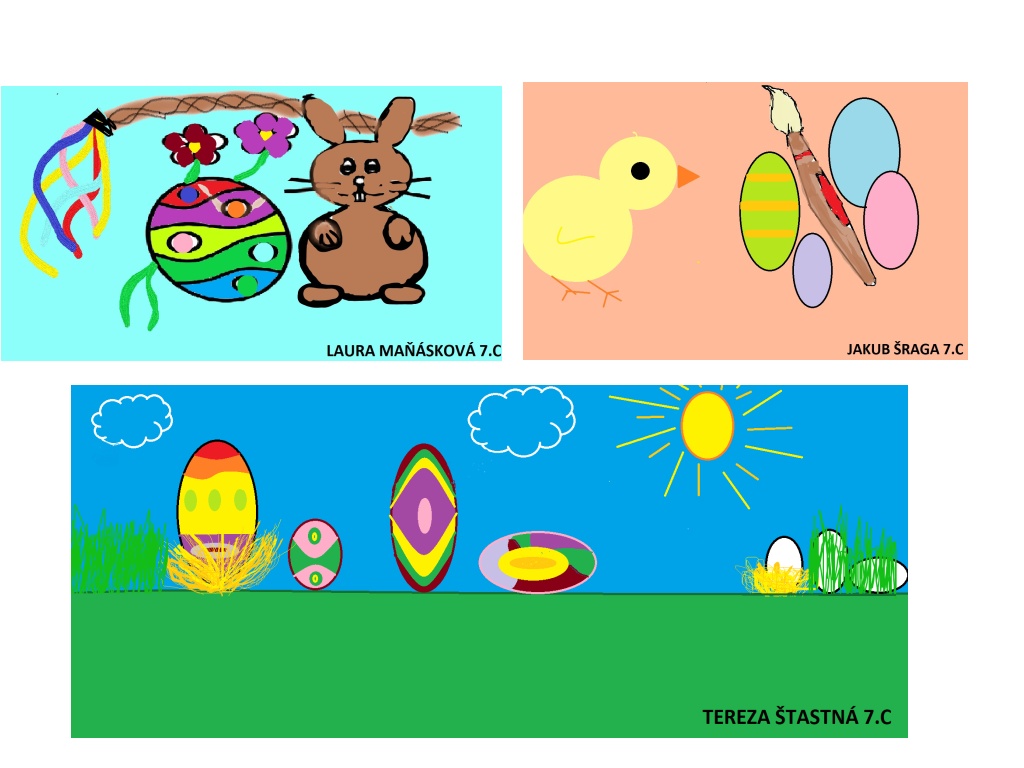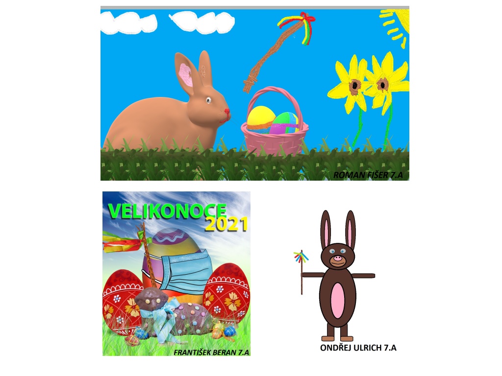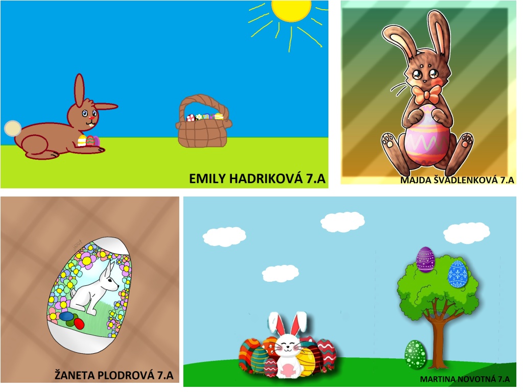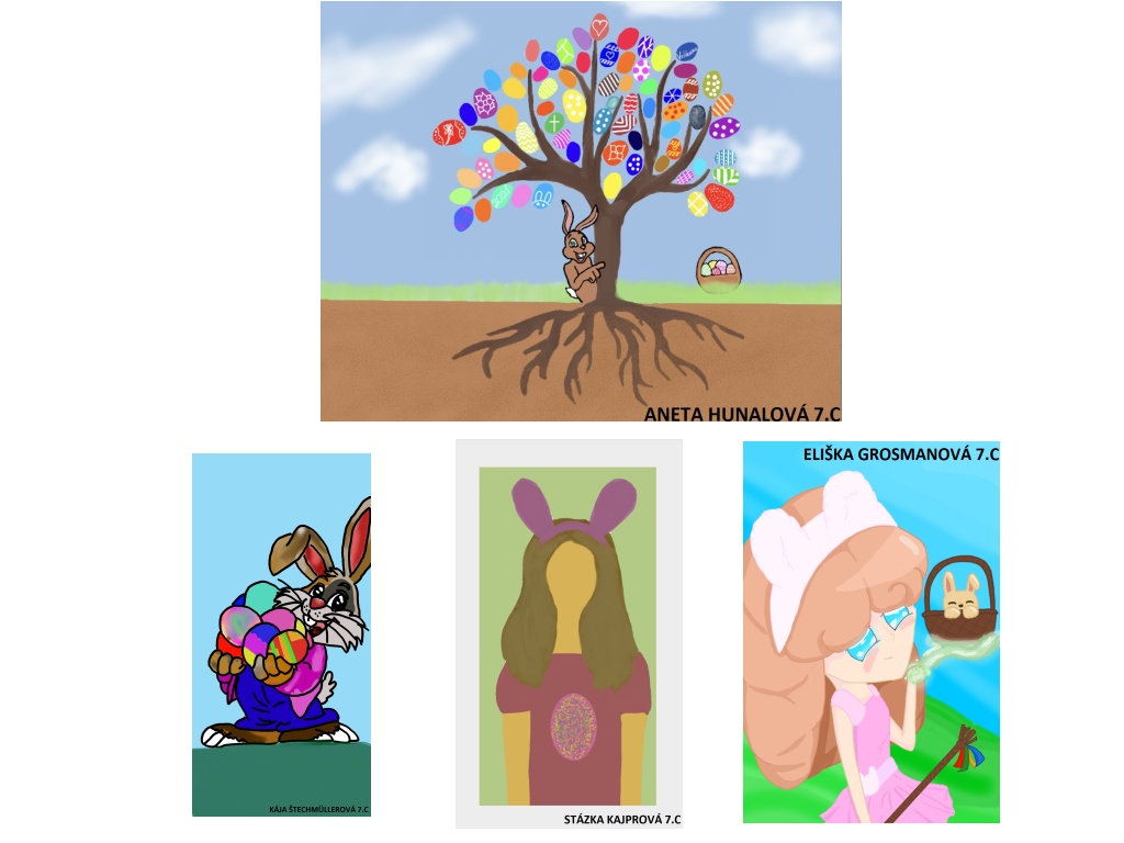 A právě elektronický obraz byl úkolem pro žáky tříd 7.A a 7.C v rámci asynchronní výuky výtvarné výchovy. Žáci měli v libovolném grafickém programu vytvořit obrázek na téma Velikonoce. Mohli malovat celý obrázek sami či mohli vytvářet koláže, kdy použili část obrázku, kterou sami namalovali, a vkládali do ní obrázky již vytvořené, např. z internetových prohlížečů. Vznikla opravdu povedená dílka, u kterých jako učitelé nestačíme žasnout nad perfektní počítačovou gramotností našich žáků. Koláže vybraných obrázků spolu se jmény jejich autorů si můžete prohlédnout pod článkem.