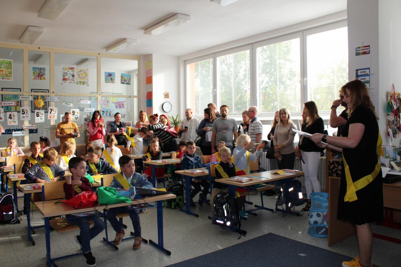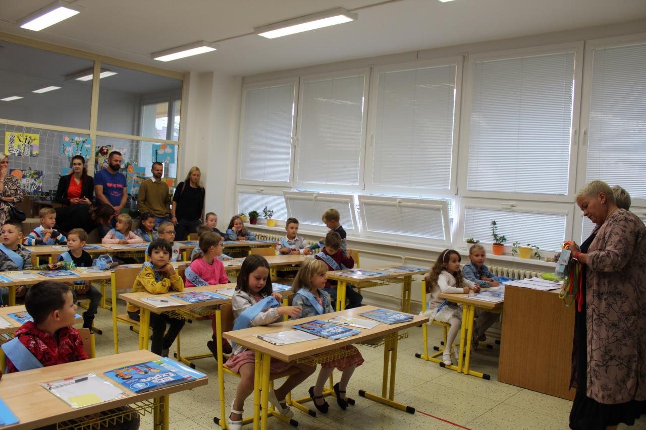 Žáky z 1.A přivítala paní učitelka Mgr. Naděžda Rybková, z 1.B paní učitelka Mgr. Iveta Herčíková a z 1.C paní učitelka Mgr. Kamila Snopová. Každý prvňáček dostal šerpu, která mu bude vždy připomínat první den ve škole.